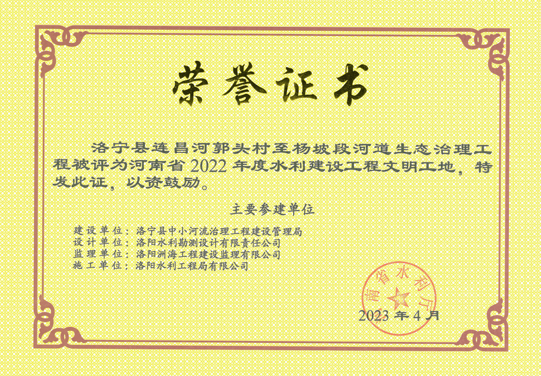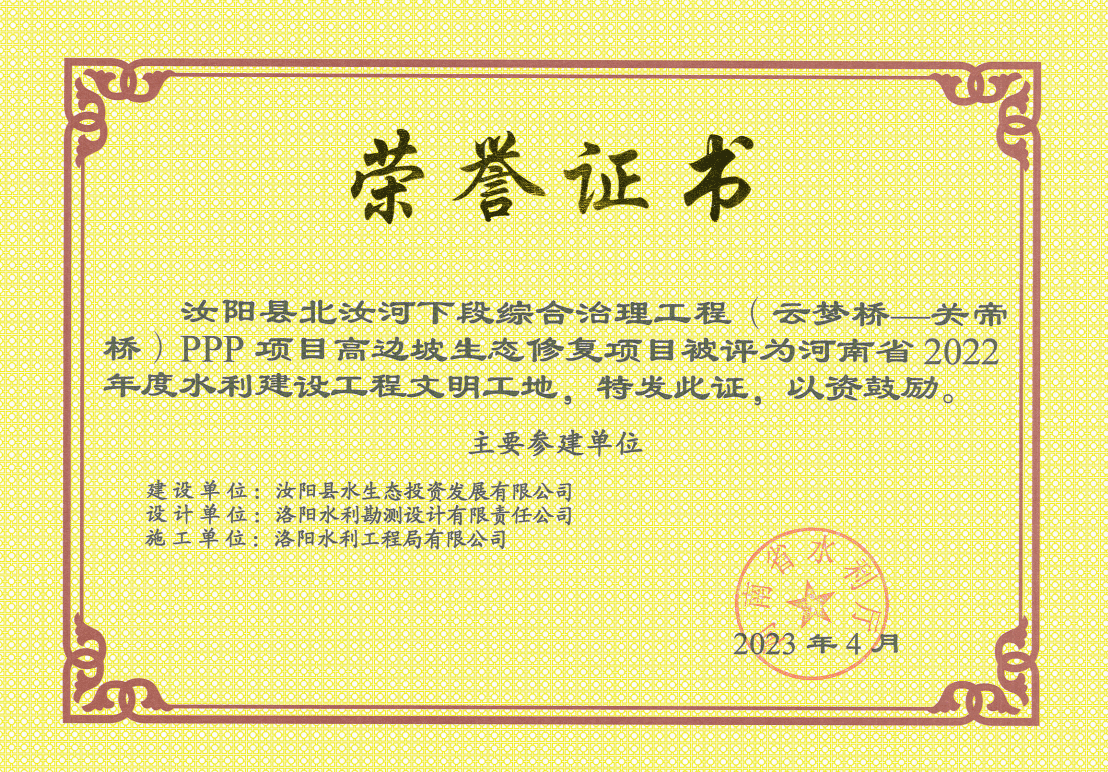 近段時(shí)間以來,公司喜訊連連,先后收到省水利廳、水利學(xué)會(huì)頒發(fā)的多份榮譽(yù)證書和獎(jiǎng)杯。其中,洛寧縣連昌河郭頭村至楊坡段河道生態(tài)治理工程和汝陽縣北汝河下段綜合治理工程(云夢(mèng)橋—關(guān)帝橋)PPP項(xiàng)目高邊坡生態(tài)修復(fù)項(xiàng)目2個(gè)項(xiàng)目被河南省水利廳評(píng)為河南省2022年度水利建設(shè)工程文明工地;洛陽市洛河?xùn)|湖攔河壩工程喜獲河南省水利工程建設(shè)“紅旗渠杯”首批優(yōu)質(zhì)工程榮譽(yù)稱號(hào)。